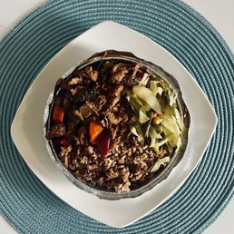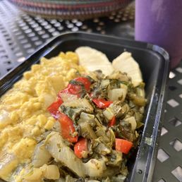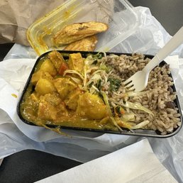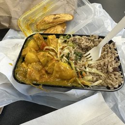 VEGAN I had the vegan curry chicken and the vegan citrus spare ribs with rice and peas, mixed veggies and plantain. This meal so yummy. I loved them both but I think I'm leaning more towards the vegan curry chicken. The rice and veggies were so delicious as well. Most of all the guy at the counter was soooo pleasant and even let us "newbies" try some before buying. Welcoming atmosphere and nice place to sit in the back.
